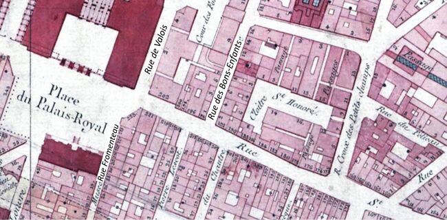 - ↑ . Voir en ligne le plan parcellaire du Palais-Royal tel qu'il figure dans le cadastre Vasserot, ca 1810]