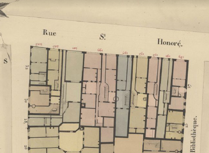 Les numéros de parcelles correspondent le plus souvent aux numéros des maisons (ou immeubles). À Paris, plusieurs systèmes de numérotation des biens fonciers et immobiliers se succèdent de l'Ancien régime à la période contemporaine. Voir leurs principes respectifs. Rue Saint-Honoré, le système de numérotage se complique pendant la Révolution du fait de la mise en place du numérotage "sectionnaire" et parce que cette artère est limitrophe de 7 sections dont chacune a une logique de numérotage particulière. Voir la vue d'ensemble des sections de la rue Saint-Honoré.