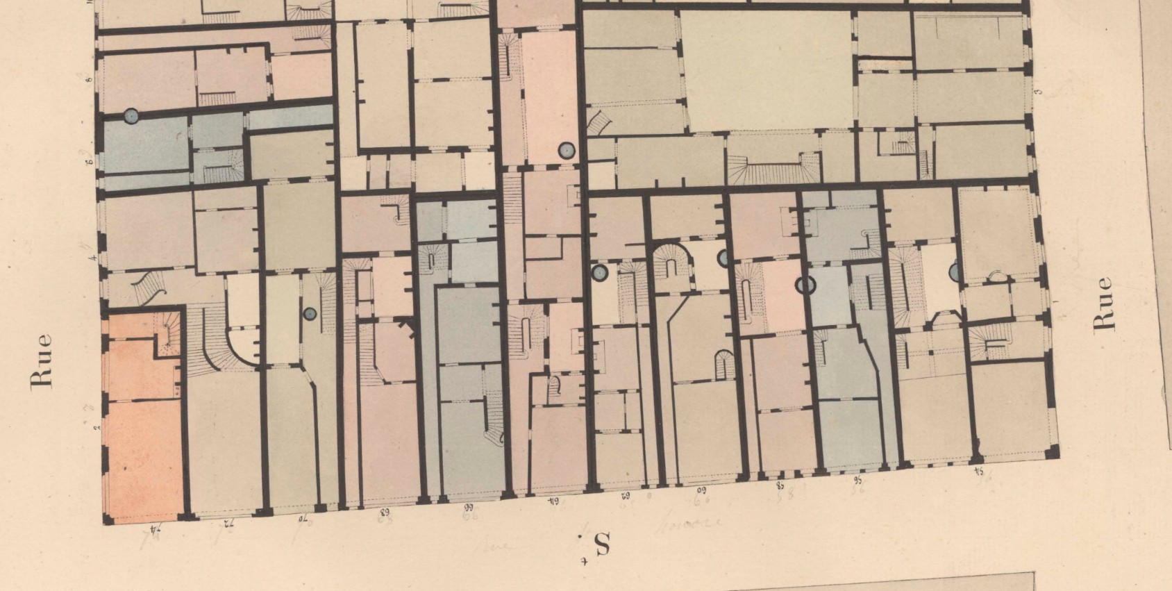 - ↑ Quartier Saint-Eustache ; Ilot 11 (AN/F/31/78/11) Voir le parcellaire du cadastre Vasserot.]