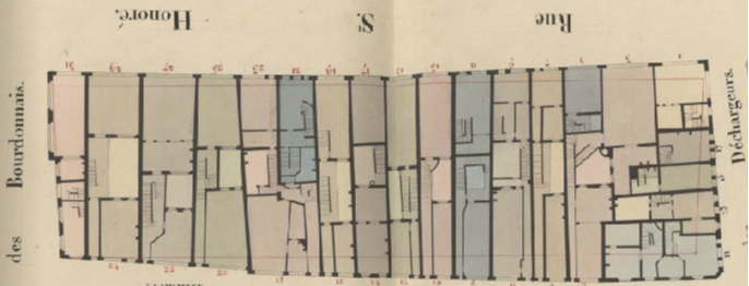 Les numéros de parcelles correspondent le plus souvent aux numéros des maisons (ou immeubles). À Paris, plusieurs systèmes de numérotation des biens fonciers et immobiliers se succèdent de l'Ancien régime à la période contemporaine. Voir leurs principes respectifs. Rue Saint-Honoré, le système de numérotage se complique pendant la Révolution du fait de la mise en place du numérotage "sectionnaire" et parce que cette artère est limitrophe de 7 sections dont chacune a une logique de numérotage particulière. Voir la vue d'ensemble des sections de la rue Saint-Honoré.